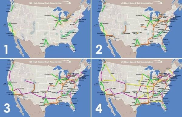 美国高铁的“四步走”规划蓝图,五大高铁项目被划入了第一步规划里。/US High Speed Rail Association