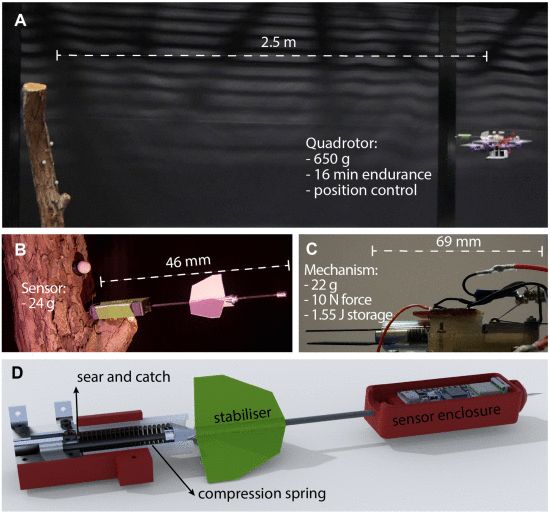 在后续实验中,研究人员使用了24g传感器吊舱,吊舱包括用于弹簧压缩的元件、飞行稳定器和用于传感器的囊。用于发射传感器的能量则是通过线性弹簧以弹性能量进行存储。