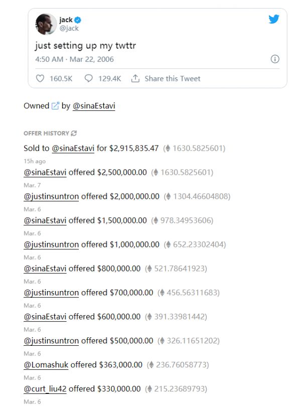 该推文从今年3月6起便作为NFT资产对外转让,到3月22日,出价最高的竞拍者为数字货币交易公司Bridge Oracle的CEO埃斯塔维(Sina Estavi),埃斯塔维以高出起拍价2.5倍的交易价格成为该资产竞标的获胜者。