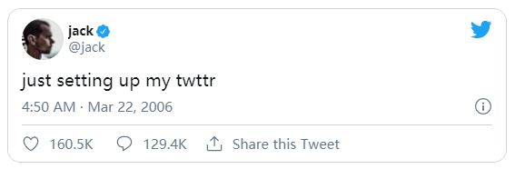 这是杰克·多西在2006年3月21日发布的第一条推文,推文称:“只是在设置我的twttr”(推特原名为Twttr,后更改为Twitter)。