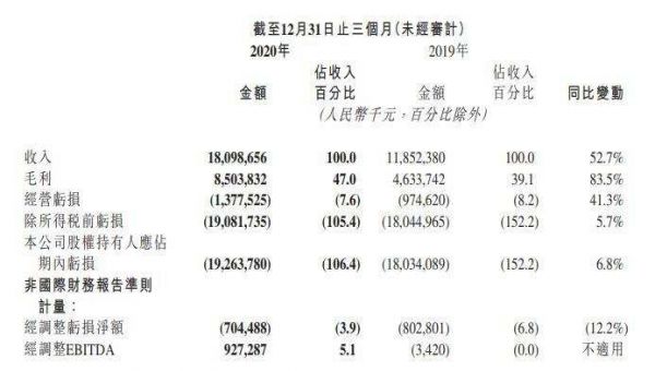 快手今日公布2020年第四季度及全年业绩,这也是快手在港上市以来公布的第一份财报。财报数据显示,2020全年营收587.8亿元,同比增长50.2%;2020年全年净亏损1166亿元,经调整亏损净额为79.49亿元。2020年第四季度营收181亿元,同比增长52.7%;净亏损192.6亿元,经调整亏损净额为7.04亿元。