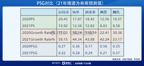 除了快手,我们也可以拿爱奇艺来对比。爱奇艺目前市值221.32亿美元,20年营收45.53亿美元,对应PS为4.86倍。然而与B站不同的是,爱奇艺20年营收增速为9.32%(B站为77%),如果以PSG(即PS/(营收增长率*100))的方法来算,爱奇艺20年PSG为0.52,B站为0.27低于爱奇艺,在这一指标上B站占优。