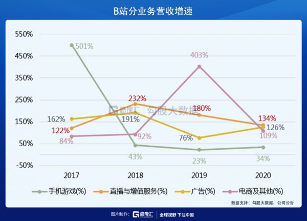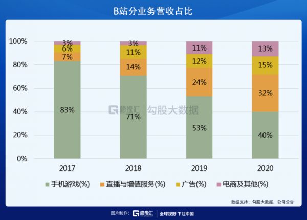 从业务结构来看,B站的业务分为四类:直播与增值服务、手机游戏、广告、电商及其他。
