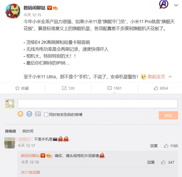 不过根据数码博主@数码闲聊站透露的消息,小米说出这一番话原来是“有底气”。据爆料,小米11 Pro堪称“旗舰天花板”,屏幕、充电、相机都是业内顶级,还加入了IP68等呼声颇高的功能特性;至于小米11 Ultra,结合微博评论来看,应该会是大幅度强化相机的产品,甚至可以理解为“加入智能手机功能的数码相机”。