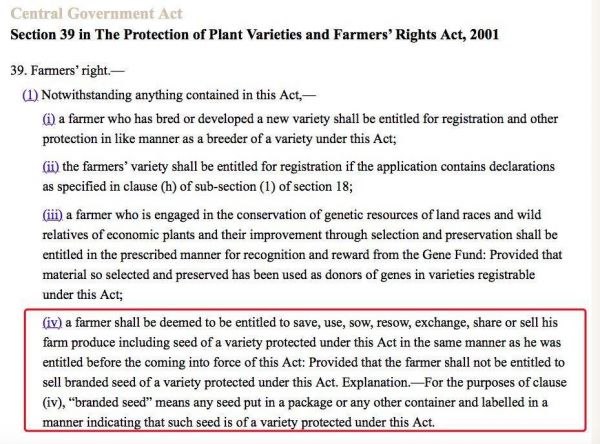 和百事公司一样,他们维权的依据也是2001年《植物品种与农民权利保护法》。该法律第39款规定,只要农民没有打着受保护品牌的名号进行销售,就允许保存、使用、播种、交换、分享和出售该品牌种子。
