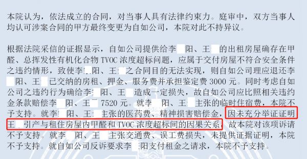 在一起案件中,身为孕妇的租客,在自如公司空气质量不合格的房间居住3个月,后胎儿发育不良导致引产,租客诉请自如公司赔偿医药费、精神损害赔偿金。不过,因未充分举证证明引产与租住房屋内甲醛和TVOC浓度超标间的因果关系,该项诉请未获法院支持。
