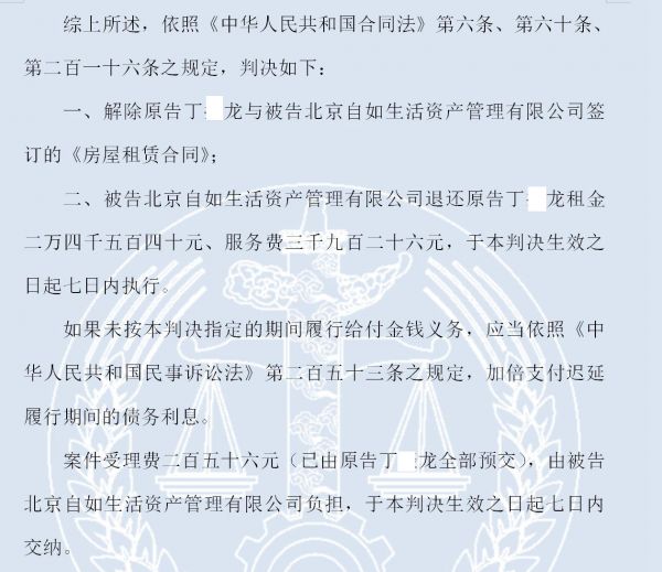 最终,顺义区法院支持了原告丁某龙的全部诉请,即解除租赁合同,退还租金24540元、服务费3926元,自如公司负担案件受理费256元。