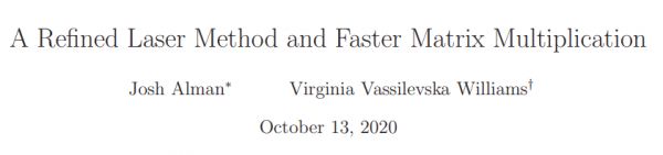 2020 年 10 月,来自哈佛大学与 MIT 的两位研究者发表了一篇论文,他们创建了有史以来矩阵相乘的最快算法,相比于之前最快算法,计算复杂度下降了 10 万分之一。其中,论文一作 Josh Alman 是哈佛大学的博士后研究生,主要研究算法设计与复杂度理论。二作 Vassilevska Williams 是 MIT 计算机科学与人工智能实验室(CSAIL)副教授,致力于将组合和图论工具应用于计算领域。