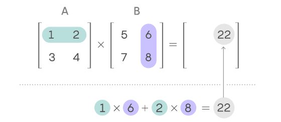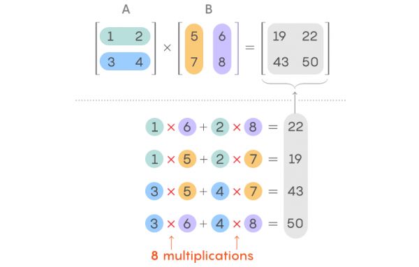为了了解该过程及其改进方法,我们首先来看一对 2 x 2 的矩阵,分别为矩阵 A 和矩阵 B。在计算它们的乘积时,需要使用矩阵 A 的对应行和矩阵 B 的对应列。具体运算方法如下图所示: