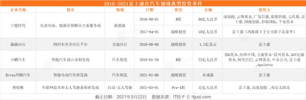 2016 年 9 月,富士康通过投资获得了宁德时代的 1.19% 的股份。宁德时代是一家锂离子电池研发制造公司,专注于新能源汽车动力电池系统、储能系统的研发、生产和销售等方面。2018 年宁德时代动力电池基本做到了全球前列的地位,是大众集团 MEB 电动车项目平台的动力电池供应商。鸿海(富士康母公司)称这笔长期投资有助于强化鸿海集团在高速发展的电动汽车市场的布局。
