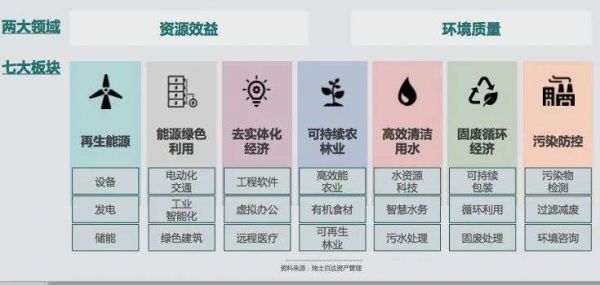 在这两大领域之下,我们又找到了7个细分领域,包括比较传统的再生能源,能源绿色利用、去实体化经济、可持续农林业、高效清洁用水,固废循环经济、污染防控。前四个属于能源效益领域,后三个是环境质量领域。
