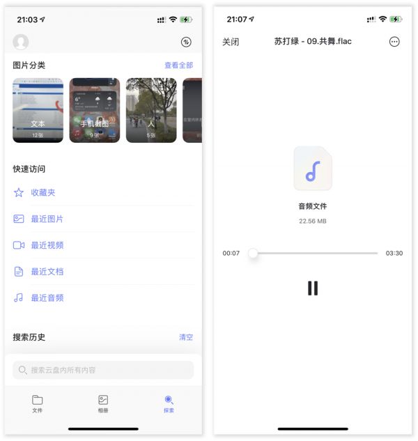对于我们备份到网盘内的图片,阿里云盘还会通过机器学习分类进行二次整理,我们可以通过「智能探索」版块进行分类检索;位于同一页面的快速访问功能也能直接跳转浏览最近上传的视频、文档、音频等常用文档类型,帮助那些有着重度使用需求的人进一步提高文件管理效率。