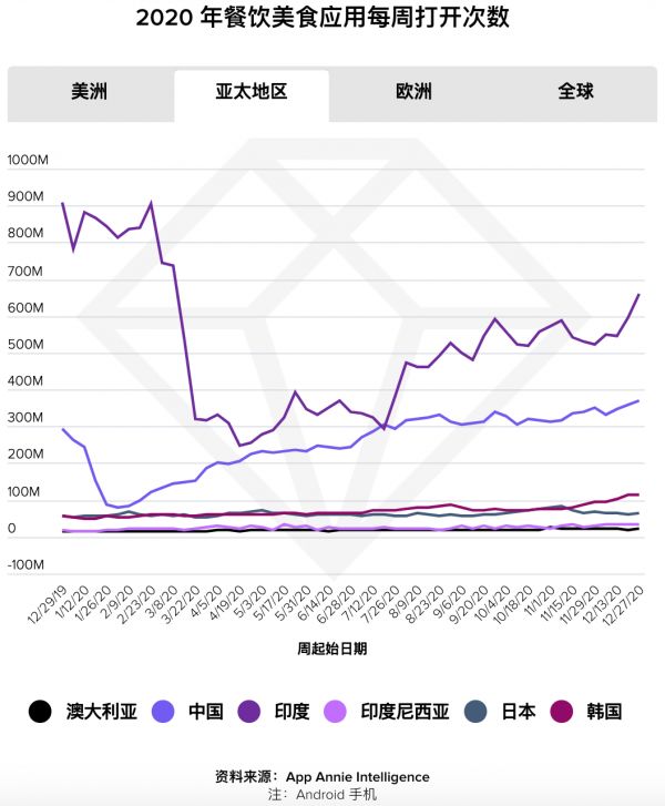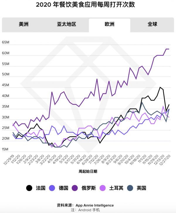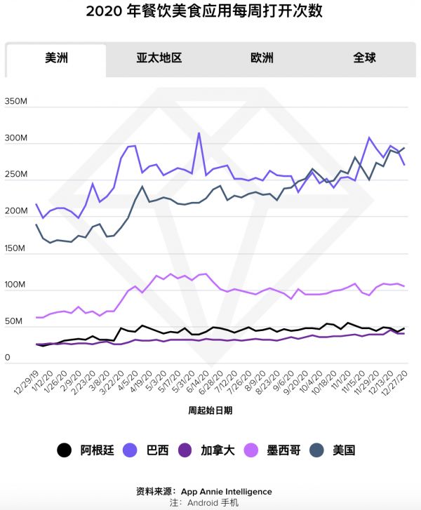 美洲、亚太地区、欧洲、全球 2020 年餐饮美食应用每周打开次数变化趋势