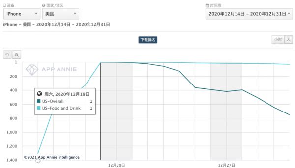 2020 年 12 月 14-31 日 MrBeast Burger 在美国 iOS 全部应用、餐饮美食应用下载排名变化