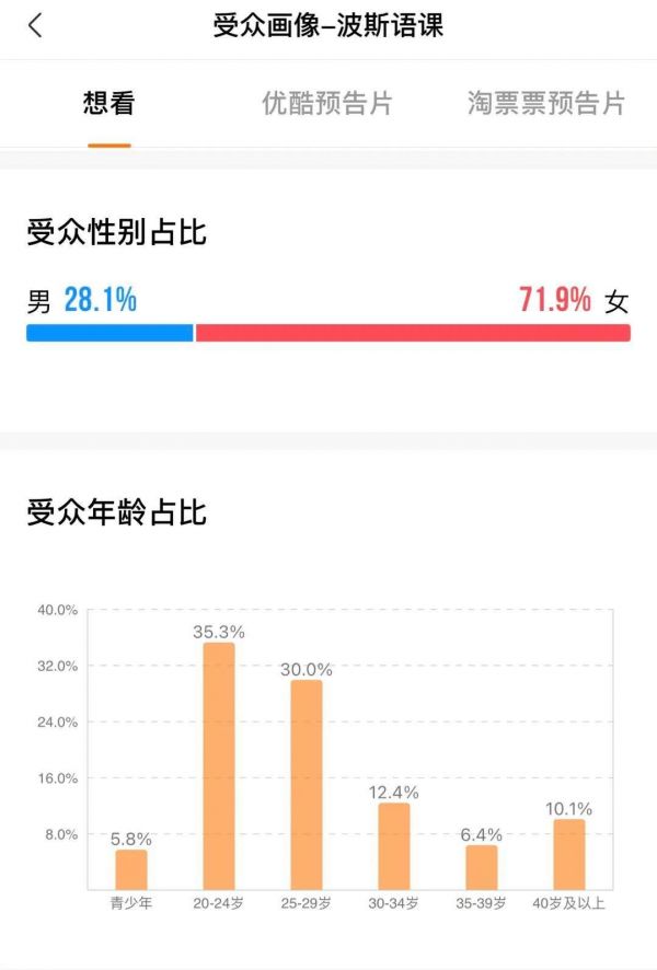 《波斯语课》并不算大众,受国外口碑辐射,观看人群以年轻观众为主。其中20~29岁的年龄群占比突破了65%。而40岁以上的观众,也颇为喜爱《波斯语课》,占比超过了10%。