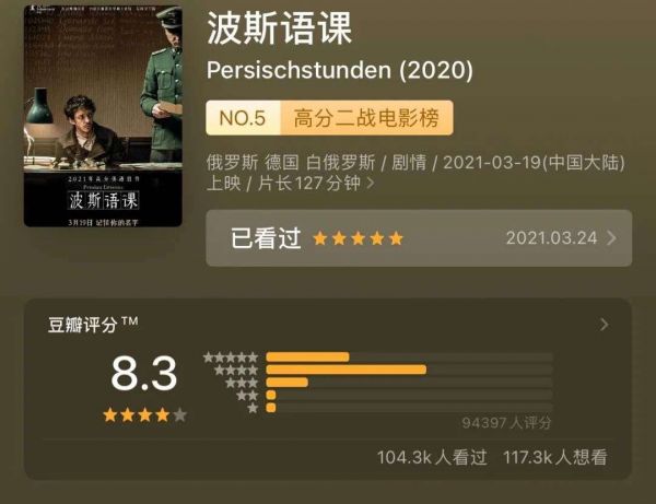 以上盛名之外,《波斯语课》的市场表现却显遗憾。在中国内地上映5天,影片票房仅1500万元,与另一部反战主题的国产文艺片《又见奈良》一同遭到冷遇。