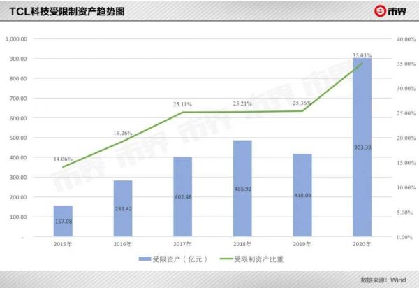 与此同时,TCL科技用作准备金、保证金、质押、抵押在内的受限制资产总额,从2018年的485.92亿元上升至903.39亿元,占总资产比重达到35.03%。