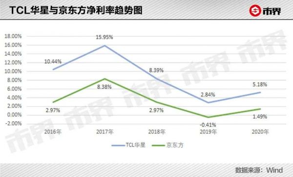 因此,TCL科技没能在2020年缩小与京东方之间的产能差距。但TCL华星明显比京东方更挣钱一些,净利率一直比京东方要高。