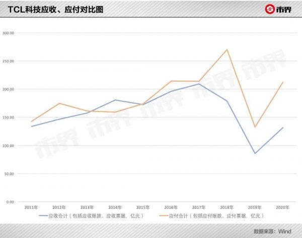 而从应收和应付的对比情况来看,2018年以前,二者基本维持在一个比较平衡的状态,但从2018年开始,应付总额大幅高于应收总额。在更大程度占用供应商资金的同时,TCL科技的财务腾挪空间也正在缩小。