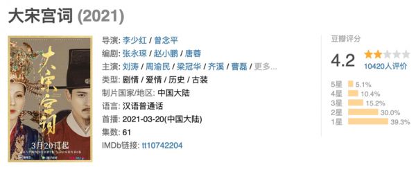 公开信息显示,在《大宋宫词》项目中,排在北京文化前面的大出品方,正是保底《你好,李焕英》的儒意影业。但显然,做北京文化电视剧作品的买卖,不如电影的性价比高,《大宋宫词》目前豆瓣开分仅为4.4。