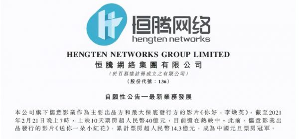 果然在《你好,李焕英》大卖27亿之际,北京文化宣告《你好,李焕英》收益仅有大跌眼镜的6000万,而港股上市的恒腾网络随后发布公告称,旗下儒意影业才是《你好,李焕英》的主要出品方和最大保底发行方,但并未透露具体额度。消息一经发布,恒腾网络股价一路飙升,月涨幅高达295%。