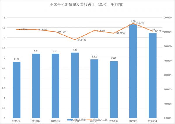 在 2020 年第三季度,雷军激动地宣布时隔六年,小米重登全球手机出货量前三。整个 2020 年,小米智能手机出货量达到 1.46 亿台,同比增长 17.5%,国内国外两开花。四季度环比上季度小幅下跌,但仍是上市以来的高位。