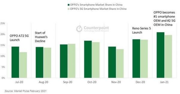 不过如果只看全球前五大厂商,那么小米的同比增速仍然是最高的,同样在国内市场,小米市场占有率由去年同期的 9.2% 上升至 14.6%,增速位列前五大厂商第一。在华为手机受挫后,小米和 OV 成了种子选手,Counterpoint Research 数据显示 2021 年 1 月,OPPO 首次跻身中国智能手机品牌第一的行列,市场份额达到 21%,小米的市场份额为 16%。在海外和国内两片市场,绿厂都是小米目前最大的对手。