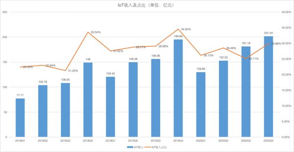 截至 2020 年 12 月 31 日,小米 AIoT 平台已连接的 IoT 设备数达 3.25 亿台(不包括智能手机及笔记本电脑),同比增长 38.0%。拥有五件及以上连接小米 AIoT 平台设备(不包括智能手机及笔记本电脑)的用户数达到 620 万,同比增长 52.9%;米家 App 12 月的月活用户数达到 4500 万,同比增长 22.1%,这一季度是小米上市以来,IoT 单季度收入首次超过 200 亿元。