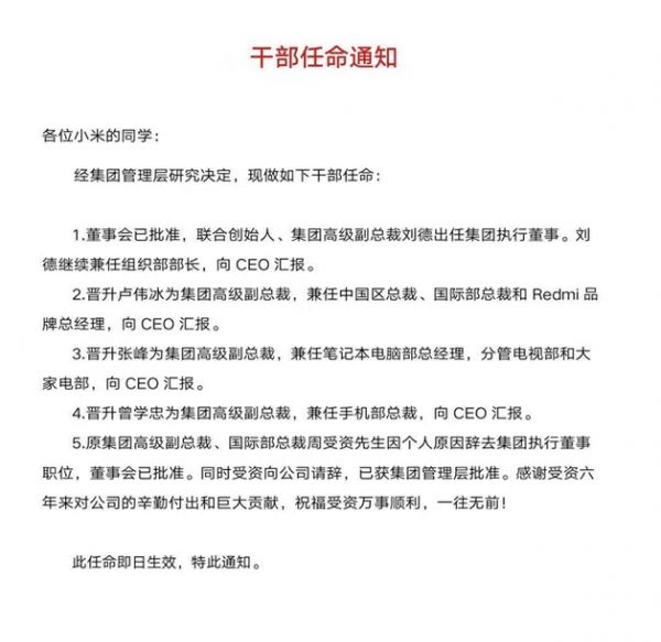 同时,联合创始人、集团高级副总裁刘德出任集团执行董事,继续兼任组织部部长;晋升张峰为集团高级副总裁,兼任笔记本电脑部总经理,分管电视部和大家电部;晋升曾学忠为集团高级副总裁,兼任手机部总裁。