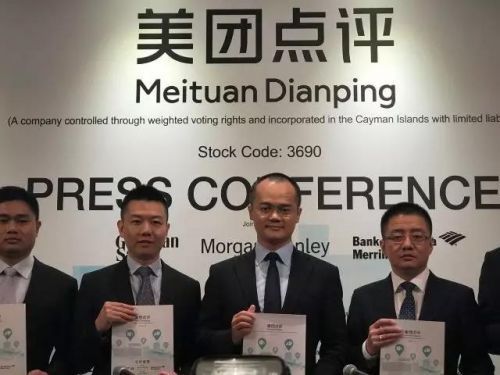 美团CFO陈少晖(左二)与王兴(左三)
