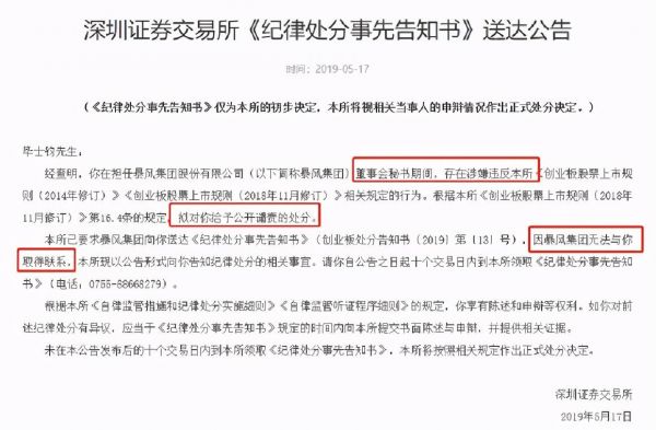 2019年5月深交所发布《纪律处分事先告知书》送达公告称,毕士钧在担任暴风集团股份有限公司董事会秘书期间,存在涉嫌违反相关规定的行为,拟对毕士钧给予公开谴责的处分。但暴风却反馈说集团无法与毕士钧取得联系。