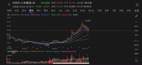 截止当日收盘,小米跌2.53%,报25港元,市值约为6300亿港元(约合5289 亿元)。