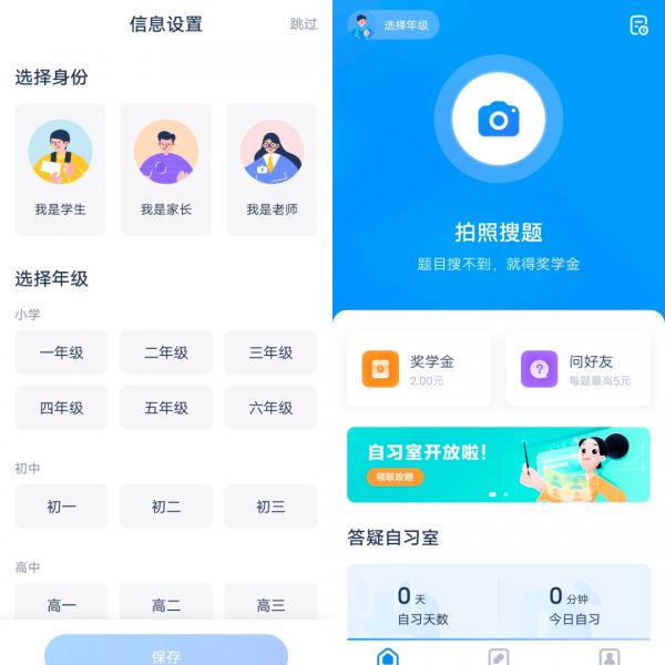 进入App前,用户需要选择对应的身份(学生、家长和老师),以及年级。当前该App覆盖了从小学到高中的教育阶段。