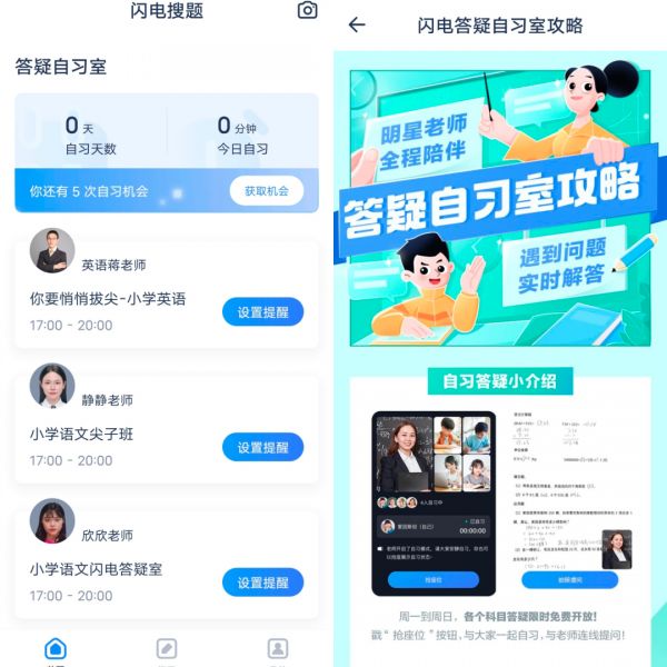 Tech星球体验“闪电搜题”App后发现,该App集合了拍题和在线自习室功能。