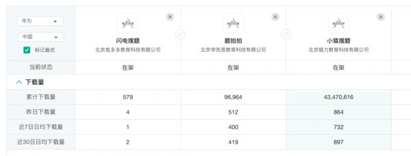 当然,作为新的入局者,字节的闪电搜题和头部产品仍然存在较大的差距,根据七麦数据显示,闪电搜题在华为端的近30日下载量仅为个位数,远低于学而思的题拍拍和小猿搜题。