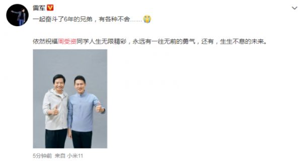 雷军,还是说了一句,“一起奋斗了6年的兄弟,有各种不舍……依然祝福周受资同学人生无限精彩,永远有一往无前的勇气,还有,生生不息的未来”。