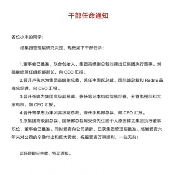 其中,卢伟冰接任周受资接档小米国际部总裁,同时获得晋升为集团高级副总裁,兼任中国区总裁、国际部总裁和 Redmi 品牌总经理,向CEO 汇报。