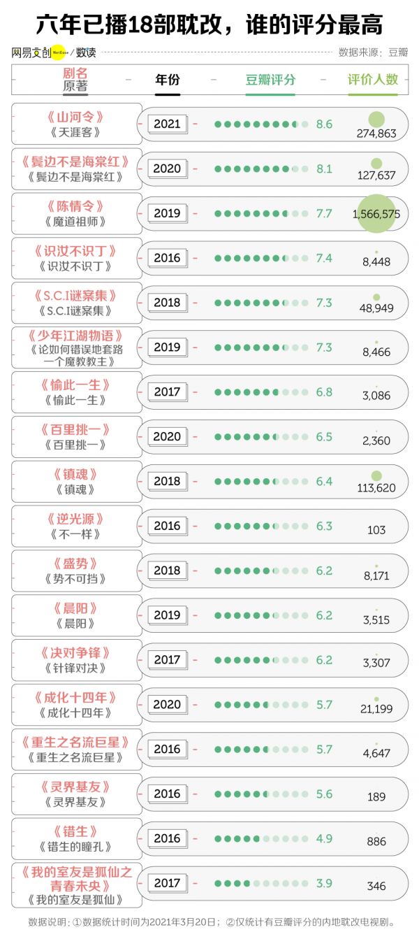 但早在《镇魂》《陈情令》之前,就已经有了多部耽改剧,只不过出圈的不多,2016 年和 2017 年共有 8 部耽改剧播出,但都没什么水花,在豆瓣上评分人数均未超过 1 万。