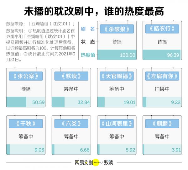 毫无疑问,这些已经确定影视化的耽改,都想成为下一个爆款。我们统计了「豆瓣磕组(耽改101)」的讨论帖,改编自 priest 同名小说的《杀破狼》热度最高,和被传即将开播的《皓衣行》讨论度不相上下。
