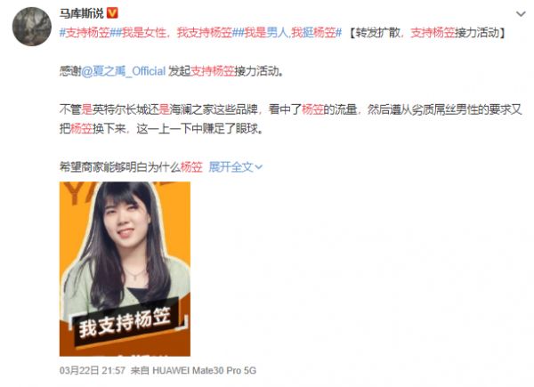 在网友们吵得不可开交的时候,一名说唱歌手夏之禹发起#我是男性,我支持杨笠#的话题活动,引得众多网友自发接力,表明支持杨笠代言的任何不歧视女性的品牌。