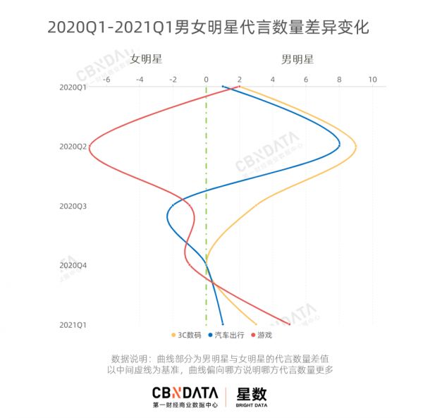 从图中可以看出,2020Q1和Q2季度,男女明星在3C数码和汽车出行类的代言差异较为明显,男明星更占优势,但在游戏领域,女明星代言数量多于男明星。Q2季度后,两者的代言差异逐渐缩小,女明星汽车出行和数码类代言上升,一度实现反超。