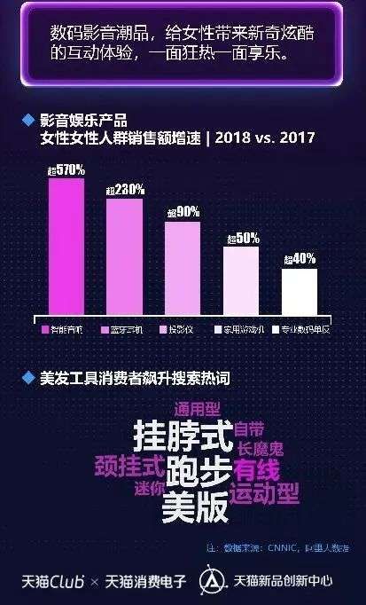 随着当代女性消费能力及消费水平的提升,在汽车、数码品类的需求和购买量也在逐渐扩大。天猫大数据统计,早在2018年,女性在消费电子总销售件数中超过5成,且女性消费者消费电子购买金额增长了32%,数码影音的主要消费者不再是男性。