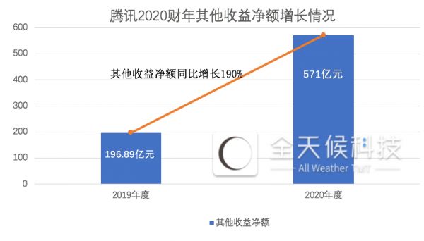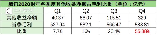 2020年Q4季度,腾讯归属于毛利中的其他收益净额(即投资收益)为人民币329亿元,2020年全年该项收益为571亿元。这不仅为腾讯的毛利输血,更为腾讯的市值撑腰。