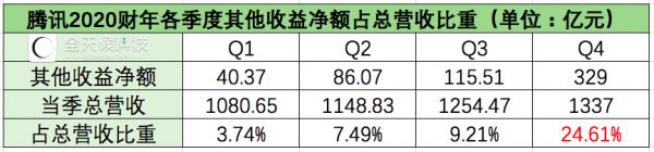 至今,腾讯2020年从Q1到Q4的其他收益净额分别为:40.37亿元、86.07亿元、115.51亿元和329亿元。Q4较Q1的其他收益净额增长了715%。