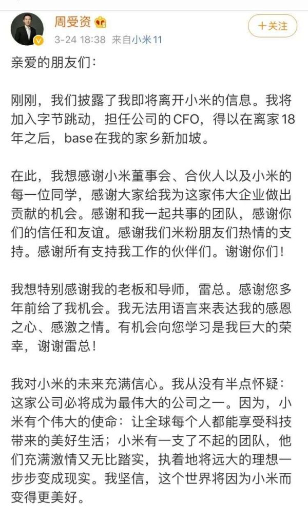 北京时间3月24日晚,品玩获悉刚辞去小米执行董事的周受资公布了个人去向,将会加入字节跳动,担任公司CFO。周受资发微博称“得以在离家18年之后,base(常驻)在我的家乡新加坡”。