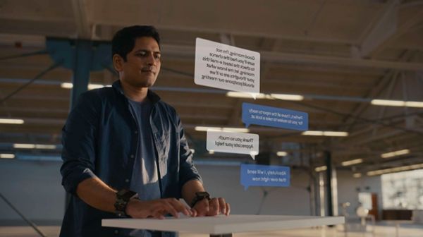 坐在角落里,不是掏出来笔记本电脑,而是戴好一副手环,一个虚拟屏幕和键盘出现了,你开始在上面编辑文档。但是咖啡馆的噪音让你很难集中注意力,这时候助手开启了入耳监听系统(IEMs)和主动降噪来弱化背景噪音。