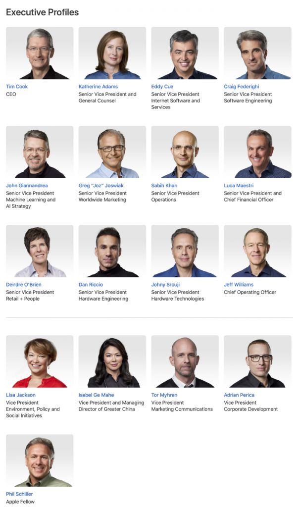 出于简化,苹果不设立独立的部门,在这里没有iPhone“子公司”,Mac“子公司”或者AirPod “子公司”。取而代之的是,他们有的是用下面这张Apple Leadership图概括的职能: