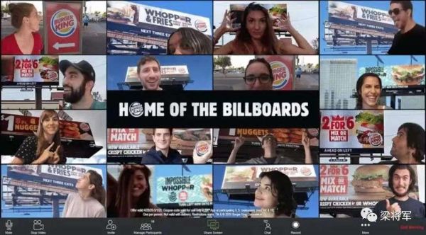 疫情期间在家办公的人,经常开视频会议。于是,汉堡王和Zoom联手,鼓励人们在视频会议中,使用汉堡王的户外广告牌当虚拟背景。