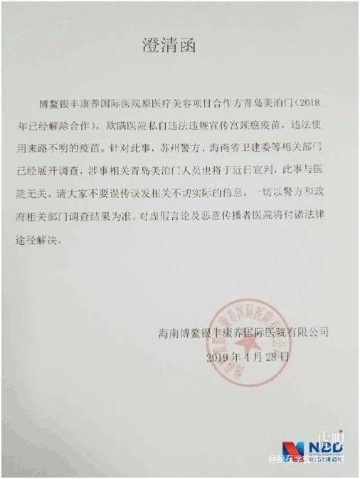 《每日经济新闻》记者从一名受害人处获悉,银丰医院给他们发来一份澄清函,称原医疗美容项目合作方青岛美泊门(2018年已经解除合作关系),欺瞒医院私自违法违规宣传宫颈癌疫苗,违法使用来路不明的疫苗。