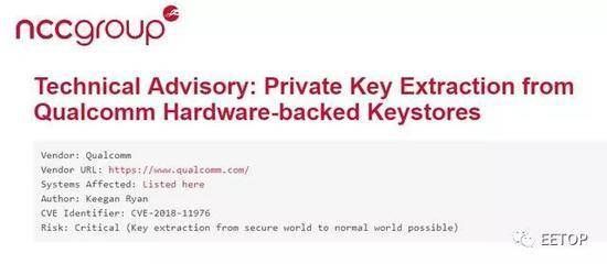 此一编号为CVE-2018-11976的漏洞,涉及高通芯片安全执行环境(Qualcomm Secure Execution Environment,QSEE)的椭圆曲线数码签章算法(Elliptic Curve Digital Signature Algorithm,ECDSA),将允许黑客推测出存放在QSEE中、以ECDSA加密的224位与256位的金钥。